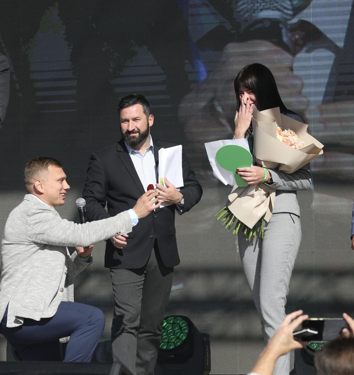 «Так сталося, що під час навчання я став не тільки «Слугою Народу», а й слугою твого серця. Катюша, кохана, сьогодні я пропоную тобі свої руку і серце. Будь моєю дружиною!», - з такими словами на сцені Володимир зробив пропозицію.