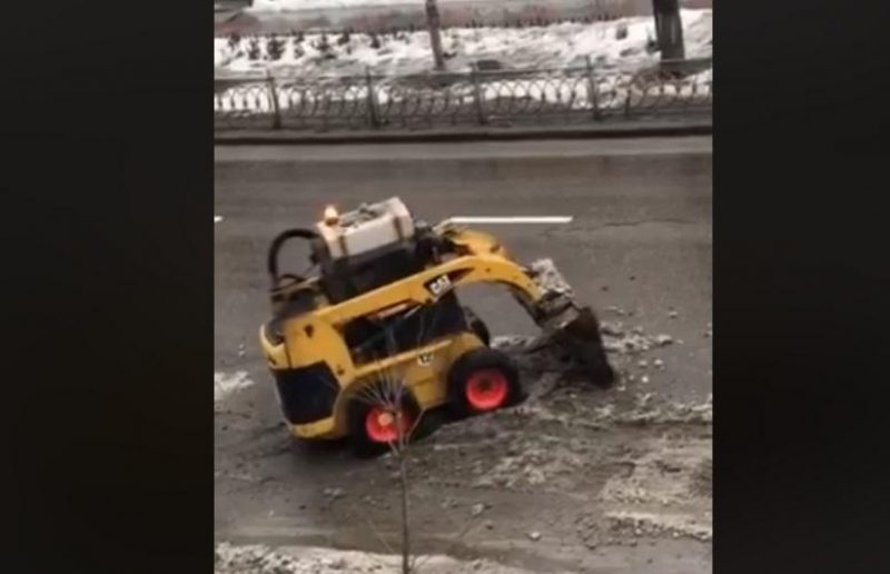 Відеозапис опублікований на сторінці "Київ автомобільний" у Facebook. На ньому видно, як водій спочатку збирає сніг ковшем з узбіччя, а потім розкидає його по дорозі.