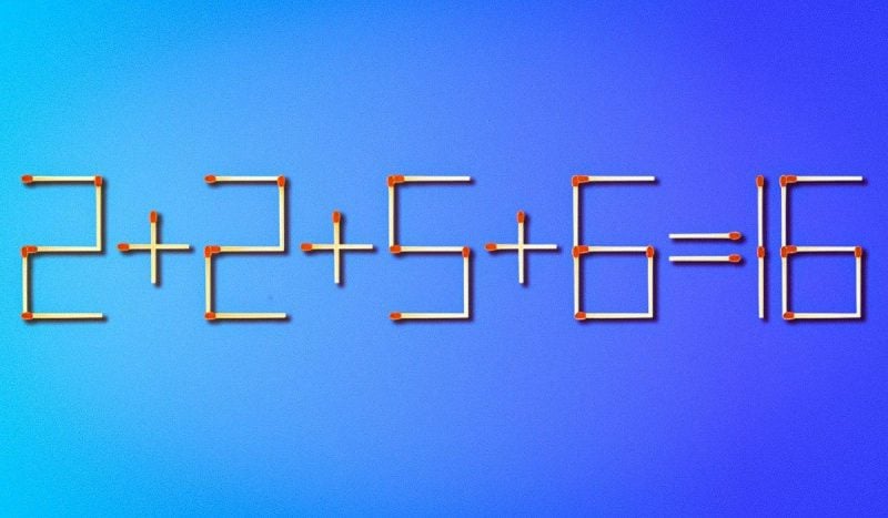 Нижче ви побачите зображення, на якому сірниками викладено рівняння 2+2+5+6=16. Очевидно, що в ньому є помилка, адже сума цих чисел мала би дорівнювати 15.