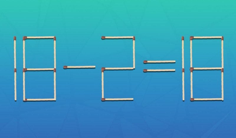 На зображенні нижче показано рівняння 18-2=18, створене з сірників. Очевидно, що воно не є правильним. Ваше завдання полягає в тому, щоб перемістити лише один сірник, аби це виправити. І зробити це треба буде всього за 5 секунд.