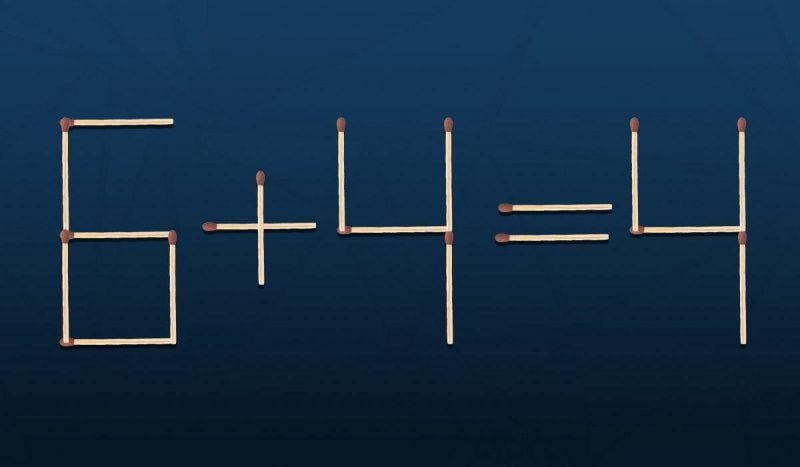 Отже, нижче ви побачите зображення, на якому за допомогою сірників викладено математичне рівняння 6+4=4. Відповідь мала би дорівнювати 10, тож очевидно, що у рівнянні є помилка.