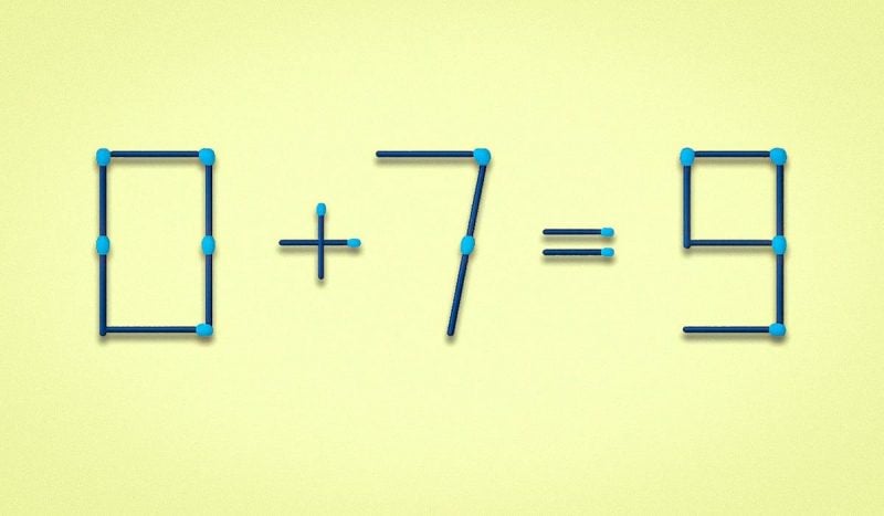 Нижче ви побачите зображення, на якому за допомогою сірників викладено рівняння 0+7=9. У ньому є помилка, яку вам належить виправити.