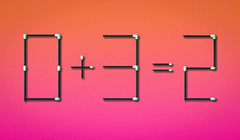 Суть головоломки - виправити неправильну рівність 0 + 3 = 2, пересунувши лише один сірник. У вас є всього 8 секунд, щоб знайти правильне рішення. Тут важлива не лише уважність, а й уміння швидко мислити та помічати нестандартні варіанти.