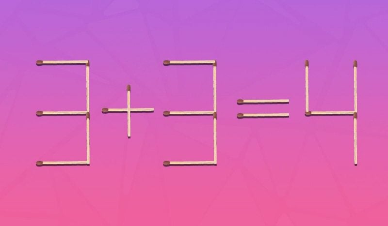 Отже, нижче ви побачите зображення, на якому сірниками викладено рівняння 3+3=4. З математичної точки зору воно не є правильним, оскільки відповідь мала би дорівнювати шести.