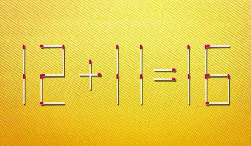 На малюнку зображена неправильна математична рівність 12 + 11 = 16. Вона складена із 23 сірників. Один із них розміщений не там, де потрібно. Якщо перемістити його в інше місце - рівність стане правильна. Ваше завдання - здогадатися, який сірник і куди потрібно перемістити.