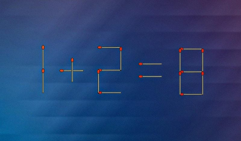 Отож, перед вами - неправильне рівняння: 1+2=8. Воно побудоване з 18 сірників. Вам потрібно перекласти всього один сірник в інше місце - і рівняння стане правильним.