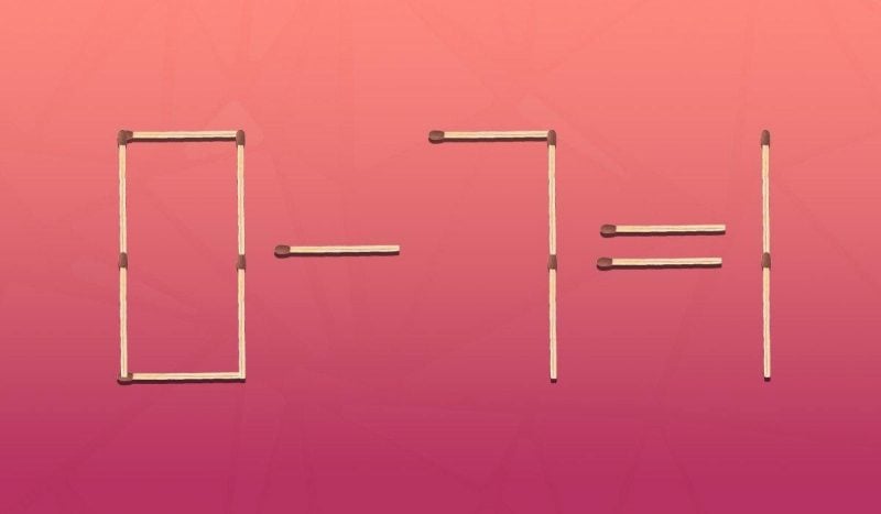 Як бачимо, потрібно було забрати верхній сірник із цифри 7 і перемістити його на знак мінус. У результаті отримаємо правильну рівність: 0 + 1 = 1. Це завдання вкотре довело: іноді найпростіші рішення потребують найбільшої кмітливості.