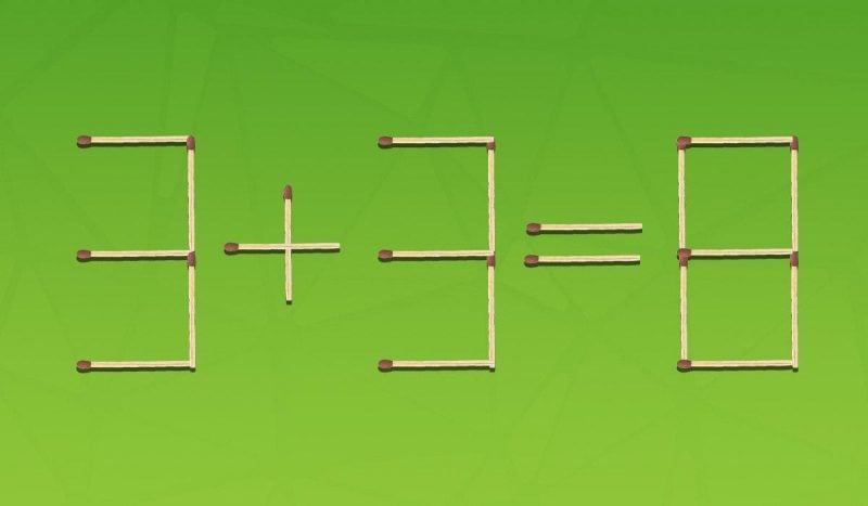 Пропонуємо вам розв'язати математичну головоломку. На малюнку ви бачите неправильну рівність, складену із 21 сірника: 3 + 3 = 8. Вам потрібно виправити її, пересунувши лише два сірники в інше місце за 10 секунд.