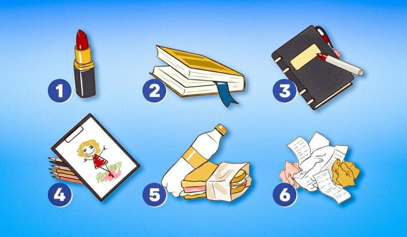 Виберіть на картинці одну річ - помаду, книжку, щоденник, канцелярське приладдя, їжу і напої або інші непотрібні дрібниці (чеки, обгортки тощо) - яку завжди можна знайти у вашій сумці. Читайте нижче, що цей вибір говорить про вас.