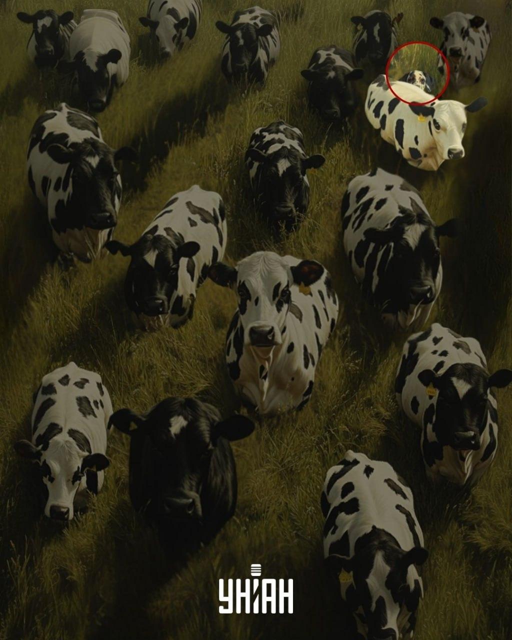 Уважно роздивіться зображення, аби відшукати собаку серед корів. Думайте, як справжній детектив, щоб розвʼязати цю головоломку.