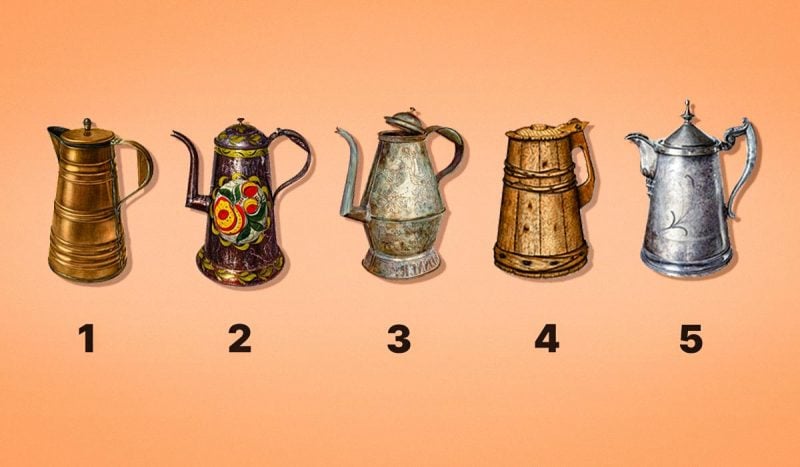 На картинці ви бачите золотий чайник, чайник із квітковим візерунком, чайник із малюнком, дерев'яний чайник і срібний - виберіть той, який вам найбільше подобається, і подивіться результати.