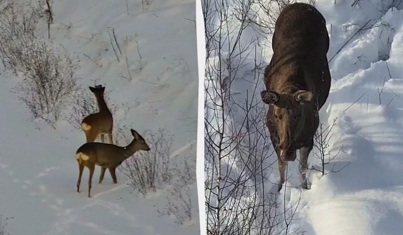 Прикордонники зафіксували лосів та козуль в українських лісах. Цікаве життя тварин зафіксував Волинський загін ДПСУ. На відео, яке ймовірно зроблено за допомогою безпілотника, можна побачити диких тварин у снігу. Зокрема лосі та козулі займаються "особистими справами" - шукають їжу та просто прогулюються лісами.