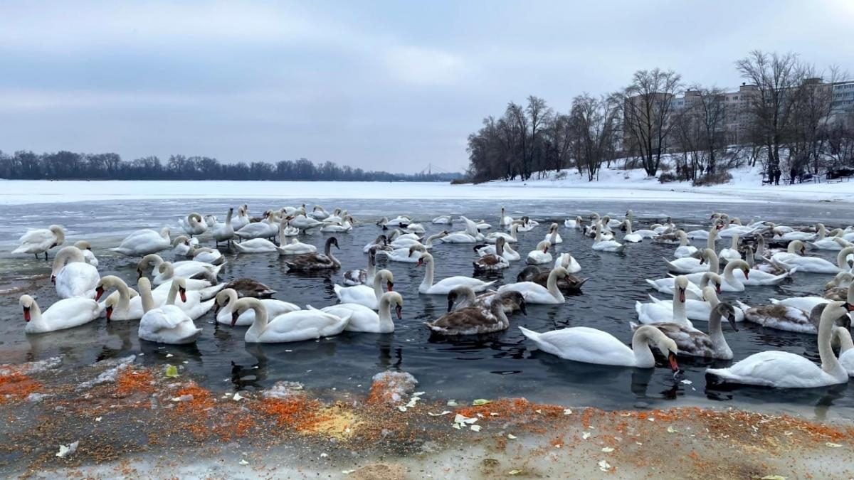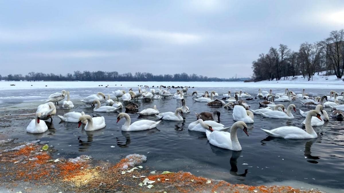 У столичному Оболонському районі можна помилуватися сотнею лебедів, які зібралися в затоці Собаче Гирло. Птахи обрали цю ділянку Дніпра, адже там вода не промерзає навіть у мороз.
