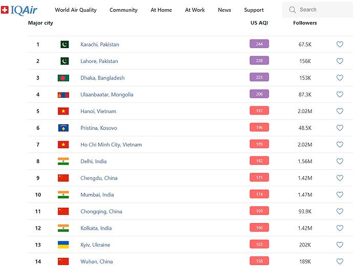 За даними ресурсу IqAir, станом на ранок 20 січня Київ знаходиться на 13-му місці світового рейтингу міст з найбруднішим повітрям.