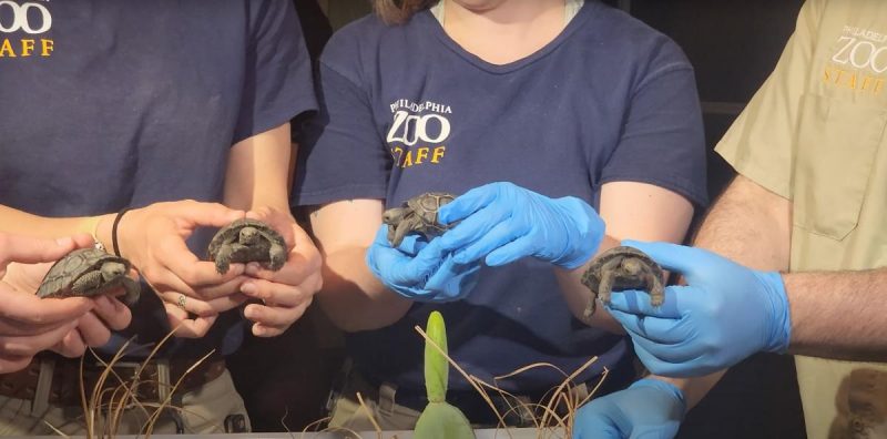 Чотири дитинчати черепахи, які перебувають під загрозою зникнення, дебютували на публіці в зоопарку Філадельфії в якості перших дитинчат своєї 100-річної матері.