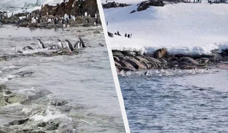 Дослідники зафіксували, як пінгвіни вистрибують з води на сушу.