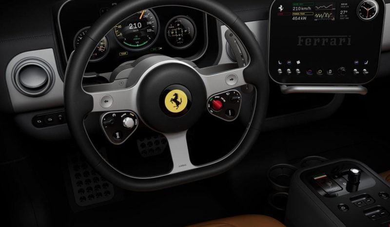 Внутрішній простір робить ставку на фізичні органи управління, а не на сенсорні екрани. Таким чином, у Ferrari відмовилися від домінуючого в електричних авто тренда на гігантські сенсорні дисплеї.