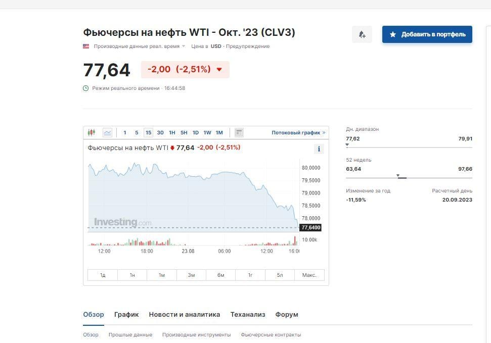Станом на 16:44 за Києвом нафта марки WTI коштувала $77,64 за барель. Ціни на нафту почали різко знижуватися на побоюваннях з приводу повільного зростання економіки Китаю, найбільшого імпортера палива в світі.