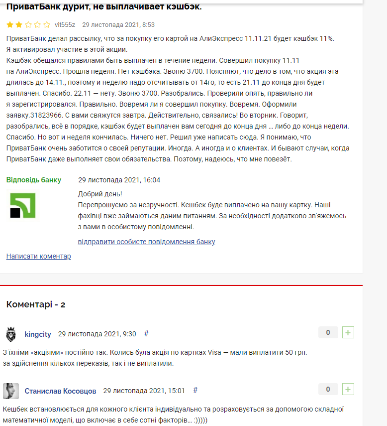 У коментарях до відгуку інші клієнти банку підтвердили, що проблеми з отриманням кешбеку в "ПриватБанку" були й раніше