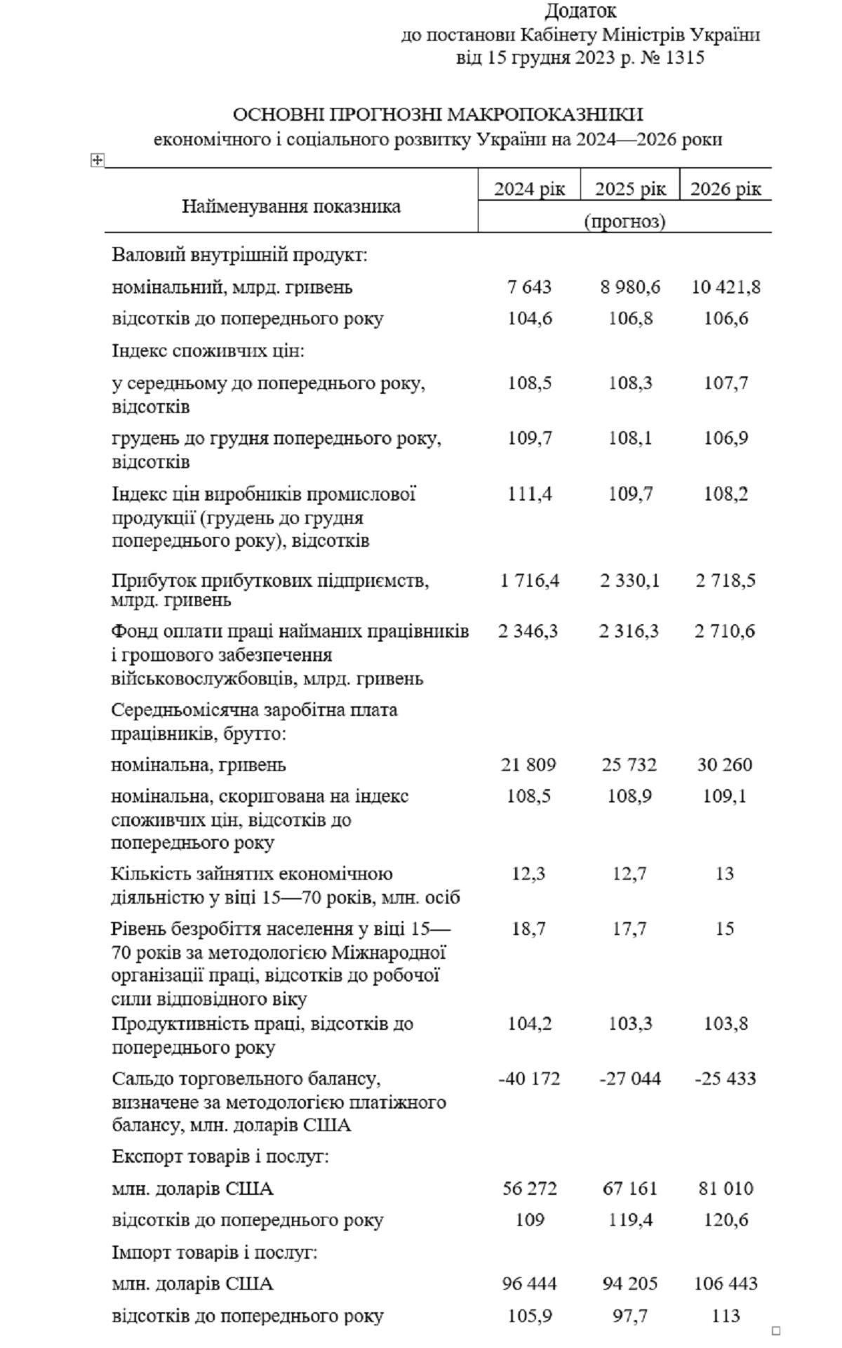 Водночас ріст споживчих цін (інфляція) у порівнянні грудень до грудня попереднього року очікується на рівні 9,7% у 2024 році, 8,1% – у 2025-му, 6,9% – у 2026-му. Відповідно, інфляція буде сповільнюватись.