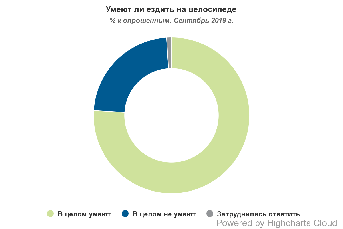 За результатами проведеного у вересні 2019 року опитування, три чверті українців (76%) вміють їздити на велосипеді, не вміють – 23%.