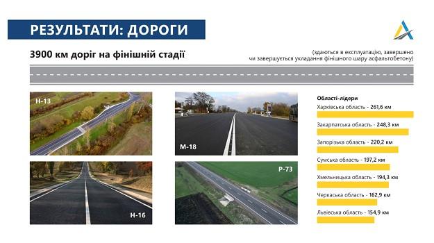 За словами Кубракова, із запланованих на 2020 рік 4200 км доріг державного значення на фініші – 3900 км. Це означає, що ділянки вже здаються в експлуатацію, закінчується влаштування верхнього шару або ж вже завершено. У лідерах – Харківська, Закарпатська, Луганська та Запорізька області.