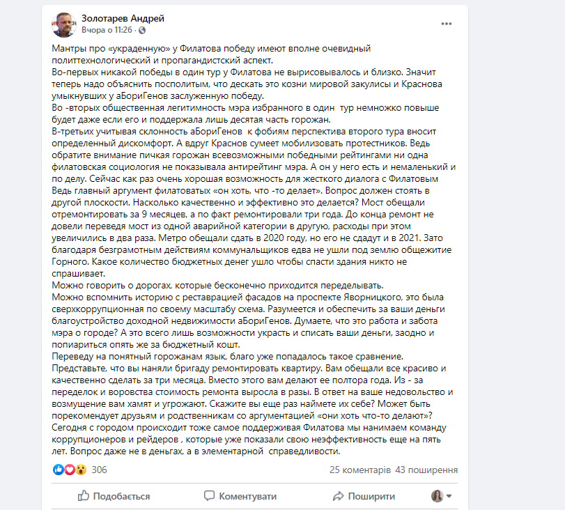 "Головний аргумент "філатових" - він хоч щось робить. Але насправді питання має стояти в іншій площині — наскільки якісно та ефективно це робиться? Міст обіцяли відремонтувати за 9 місяців, а за фактом ремонтували 3 роки. Але до кінця не довели, й бюджет зріс у два рази. Метро обіцяли здати у 2020-му, але не здадуть і у 2021-му.зате завдяки безграмотним діям комунальників гуртожиток гірського мало не пішов під землю, а яка кількість грошей пішла, щоб врятувати будівлю, ніхто не запитує. Можна говорити про дороги, які без кінця переробляють, про ремонт фасадів, який став надкорупційною за своїм масштабом схемою. Думаєте, що це робота або турбота мера про місто?"- пише Золотарьов.