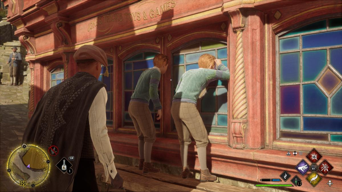 Відсилання показав відвідувач форуму Reddit під псевдонімом Zangetsuee. Він опублікував зображення двох персонажів з рудими шевелюрами, які заглядають у вітрину магазину жартів "Зонко" в Гогсміді. У книгах Фред і Джордж часто відвідували заклад, щоб поповнити свої запаси для розіграшів. Однак події Hogwarts Legacy розгортаються в XIX столітті, коли Близнюки ще не народилися. Тому рудоволосі брати — це лише "великодка".