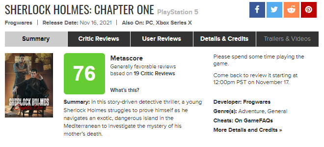 На Metacritic (PS5-версія) Sherlock Holmes Chapter One отримала 76 балів після 19 рецензій. Така ж оцінка присутня на сторінці проекту для ПК, але там всього 9 оглядів. Варіант для Xbox Series X має лише 70 балів при семи думках від критиків.