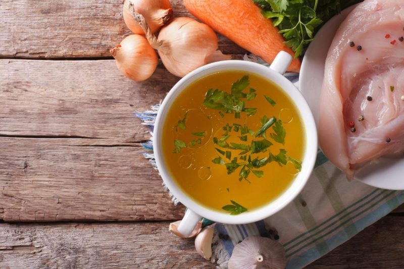 Курячий бульйон теж варять на кістках, але, як правило, на них все одно є м'ясо. Більше того – іноді господині використовують повністю м'ясні частини тушки – наприклад, філе. Якщо вивчити дані Міністерства сільського господарства США, стане зрозуміло, чому бульйон на кістках кращий і поживніший – справа, як мінімум, у кількості білка на порцію. Одна склянка курячого бульйону містить 6 грамів білка, а кісткового, як ми вже говорили, – до 10. Хоча, крім білка, курячий бульйон багатий на залізо, кальцій, калій і фолат – натуральну форму вітаміну В9.