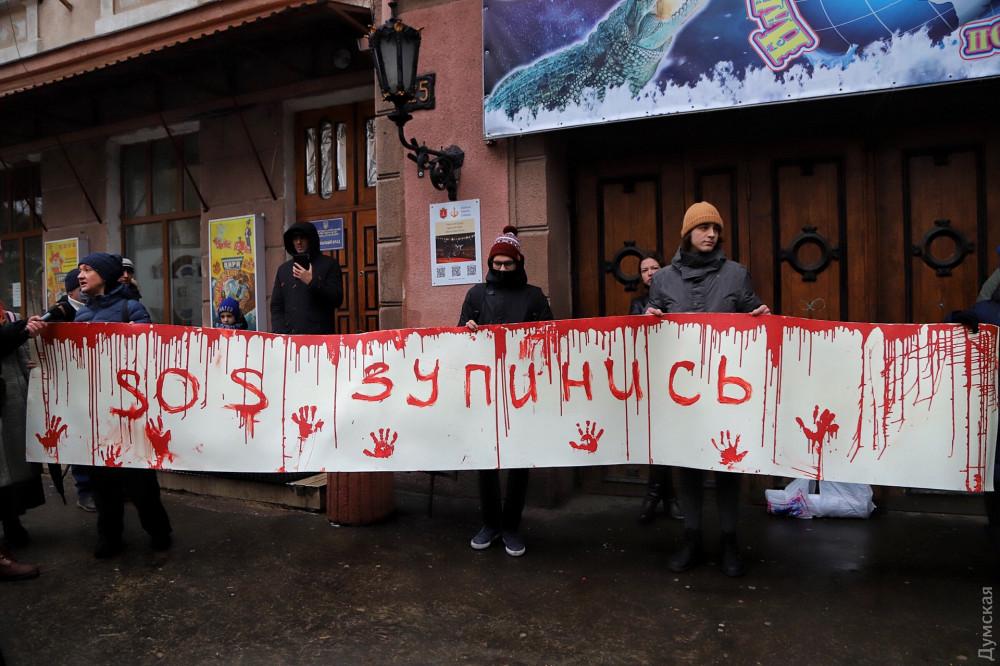У відділі комунікацій Головного управління Національної поліції в Одеській області заявили, учасники акції, незадоволені жорстоким, на їхню думку, поводженням з тваринами, блокували вхід до цирку.