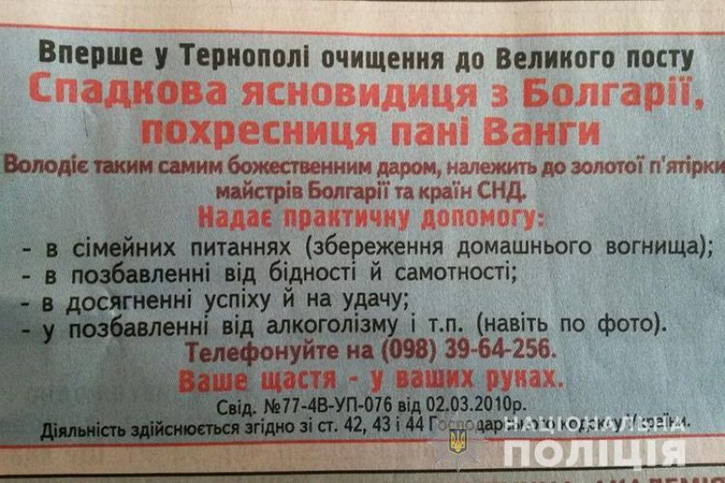 Як повідомили УНІАН в секторі комунікацій головного управління Національної поліції України в Тернопільській області, жінка розмістила в місцевій газеті оголошення, що вона є спадковою ясновидицею з Болгарії, похресницею Ванги і допомагає в сімейних питаннях, позбавляє від бідності й самотності, привертає успіх та удачу, лікує важкі хвороби, а також позбавляє від алкоголізму.