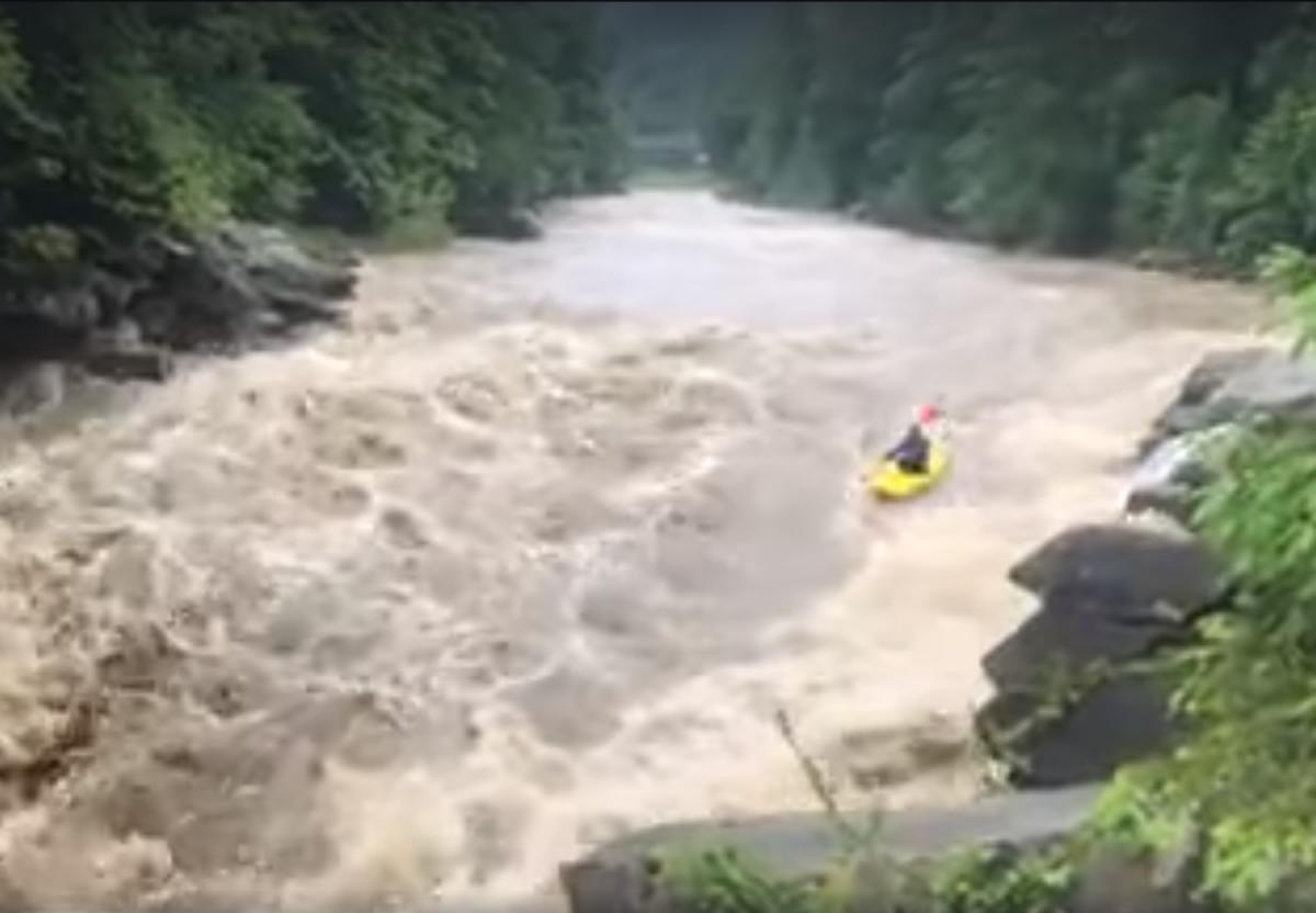 У перший день негоди на Прикарпатті екстремал здійснив ризикований сплав на водоспаді "Пробій" у Яремче.