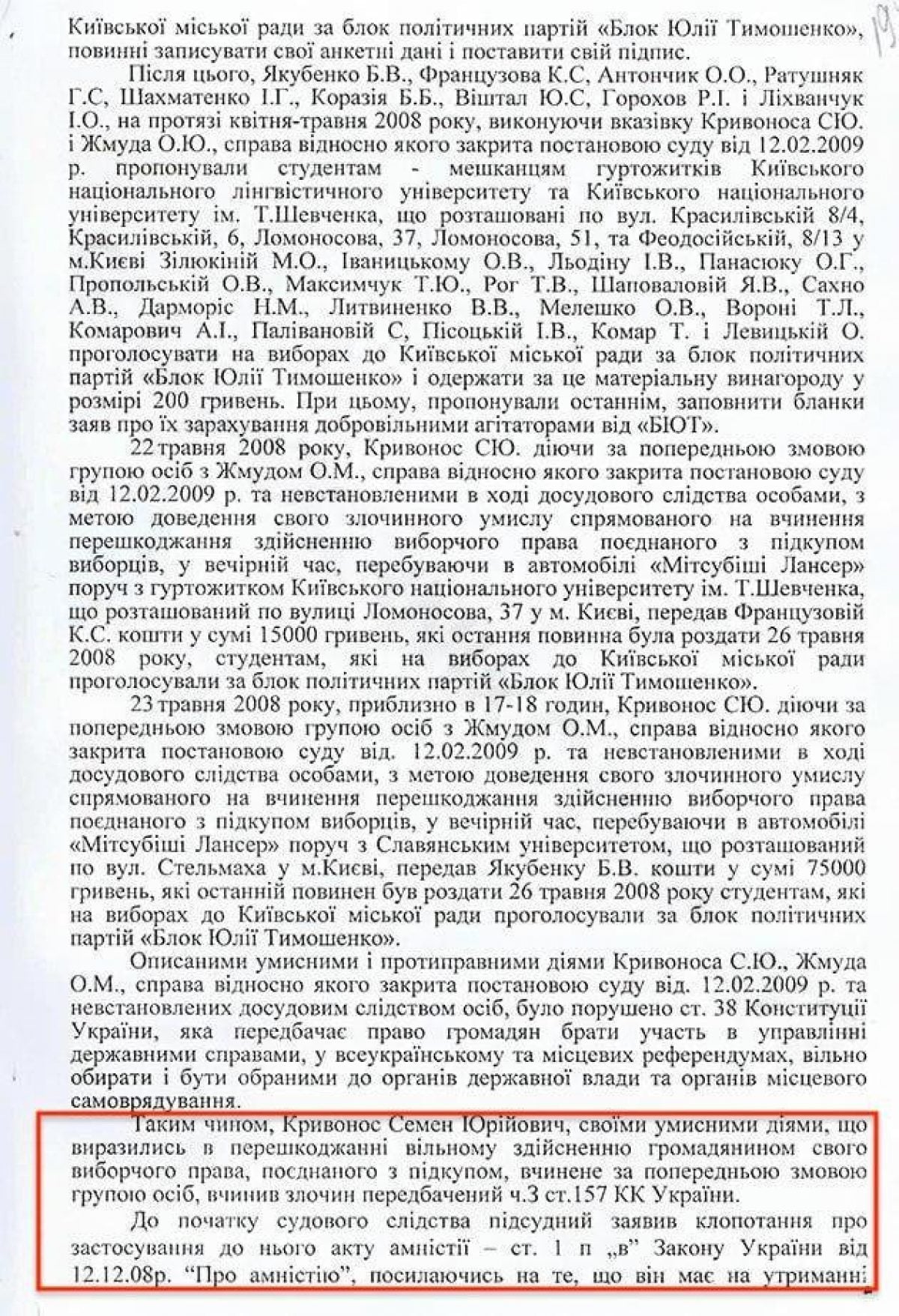 Видання нагадало, що директор НАБУ Семен Кривонос отримав обвинувальний судовий вирок у справі щодо підкупу виборців на користь Блоку Юлії Тимошенко. Проте у червні 2009 року був звільнений по амністії через наявність у нього малолітньої дитини. За інформацією ЗМІ, він нібито всиновив хлопчика і завдяки цьому уникнув ув’язнення.