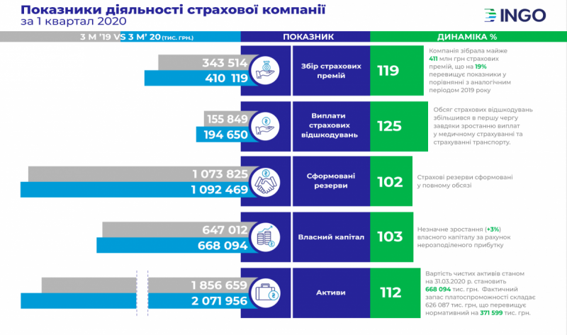 За підсумками 1 кварталу 2020 року АТ «Страхова компанія «ІНГО» зібрала понад 410 млн грн страхових премій, що на 19% перевищує показники у порівнянні з аналогічним періодом 2019 року.