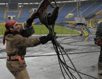 Будівельники прикріпляють металеву конструкціїю під час реконструкції стадіону ”Металіст” у Харкові, у вівторок 10 лютого 2009 р.