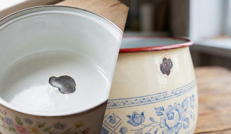 Коли на емальованій каструлі, відрі або мисці з'являється відкол, це не тільки "некрасиво" – пошкоджене місце оголює метал, і він, стикаючись з вологою та повітрям, потихеньку іржавіє. Згодом іржа може проникнути глибше, і в результаті з'явиться дірка.
