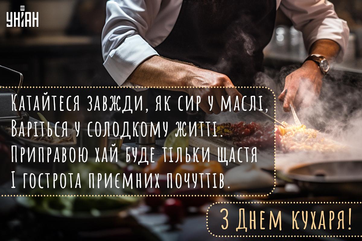 Вітаю з Міжнародним днем кухаря! Бажаю смачно не тільки готувати, а й жити. Нехай щодня дарує натхнення для творчості на кухні. Нехай кожен рецепт буде вдалим, а кожна страва - дивовижною. Бажаю здоров'я, енергії, бадьорості та сил. А ще побажаю частих свят життя, любові, підтримки сім'ї та удачі!