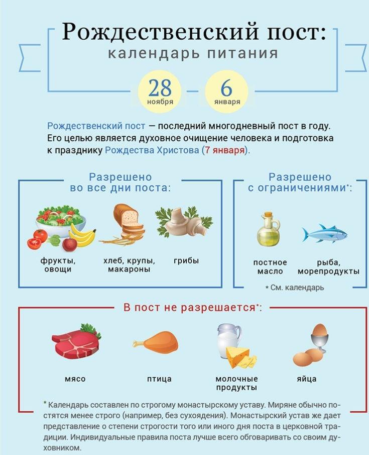 Як і під час будь-якого іншого посту, згідно із церковним монастирським уставом, під заборону в Різдвяний підпадають м’ясо, яйця, молоко та молочні продукти. Основу ж пісного столу в цей період становлять овочі, фрукти, каші, гриби, бобові, горіхи.
