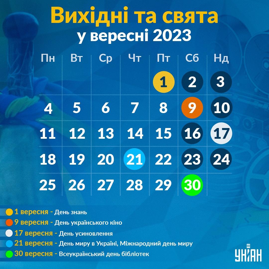 Вихідні дні вересня 2023: 2, 3, 9, 10, 16, 17, 23, 24, 30 число.