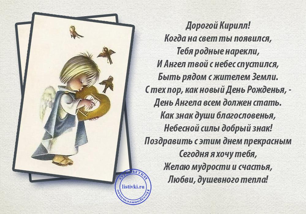 Добрий, милий і відважний, бравий чоловік на ім'я Кирило, вітаю тебе з твоїм святом. Бажаю, щоб життя приймало тільки вхідні дзвінки щастя, радості і удачі, щоб будь-яка справа була тобі по плечу, щоб серце гаряче кохало і було щиро коханим, щоб душа завжди прагнула до заповітної мрії.