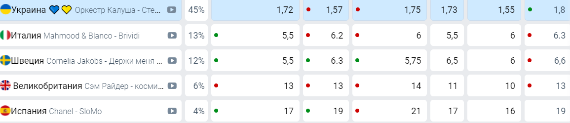 І якщо масштабну перемогу пророкують українській групі Kalush Orchestra, при чому з великим відривом, то ось в список аутсайдерів з першого півфіналу потрапили аж 7 країн.