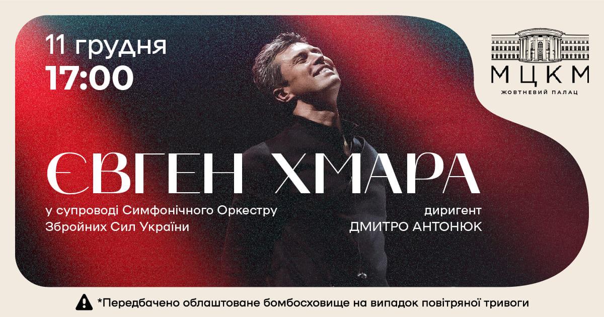Уже цієї неділі, 11 грудня, о 14:00 та 17:00 у "Жовтневому Палаці" в Києві відбудеться особливий виступ українського композитора та піаніста-віртуоза Євгена Хмари у супроводі симфонічного оркестру Збройних Сил України під керівництвом Дмитра Антонюка. Слоган заходу – "Музика під час війни стає і знеболювальним, і заспокійливим".