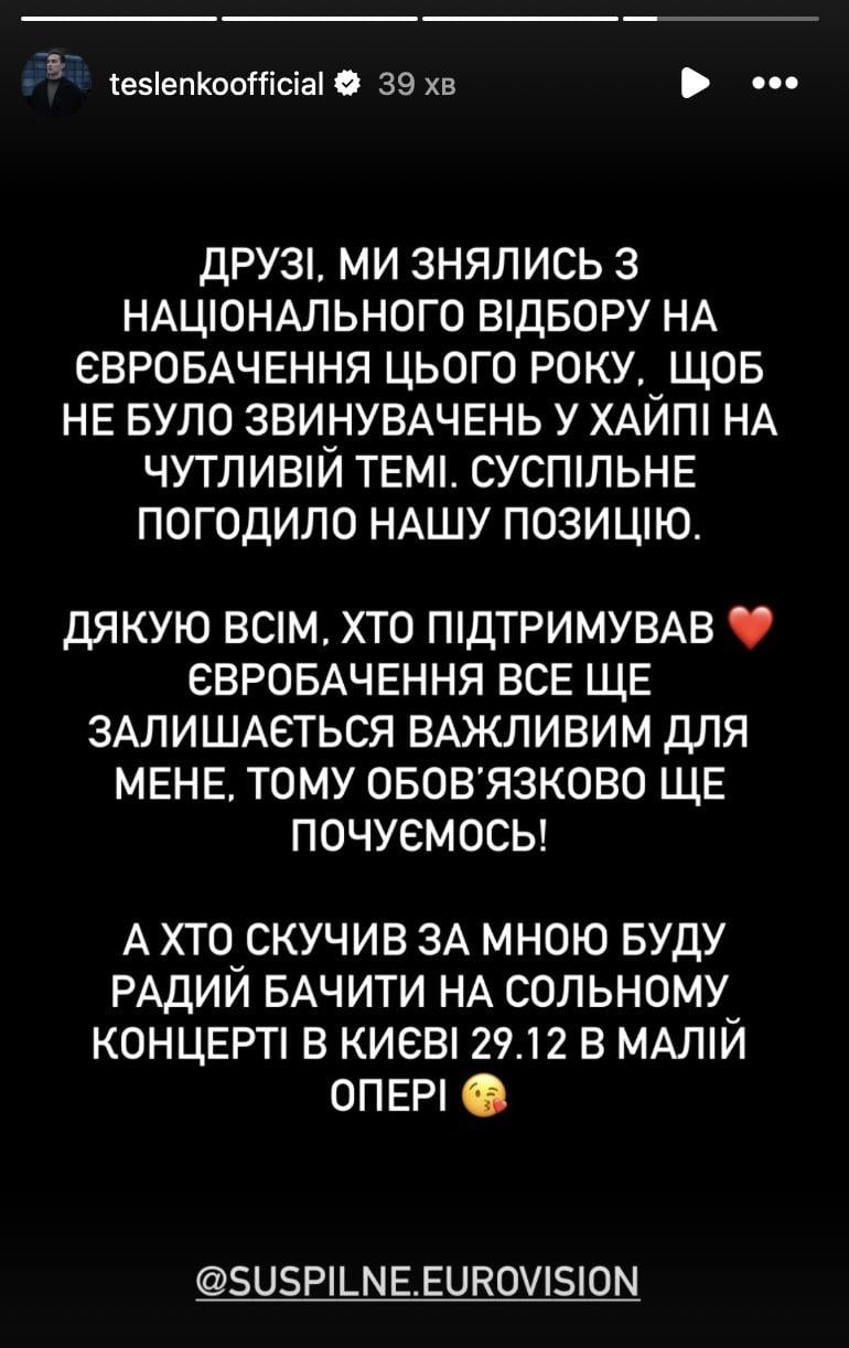 "Друзі, ми знялись з Національного відбору на Євробачення цього року, щоб не було звинувачень у хайпі на чутливій темі. Суспільне погодило нашу позицію. Дякую всім, хто підтримував. Євробачення все ще залишається важливим для мене, тому обов'язково ще почуємося", – написав TESLENKO.