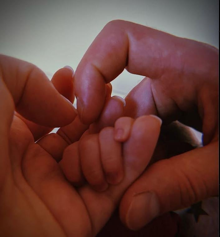 В своєму Instagram дружина актора опублікувала лише перше фото з крихіткою. На ньому помітна лише рука новонародженої доньки, яку ніжно тримають новоспечені батьки.