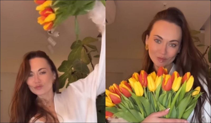 На відео артистка танцює з шикарним букетом тюльпанів.