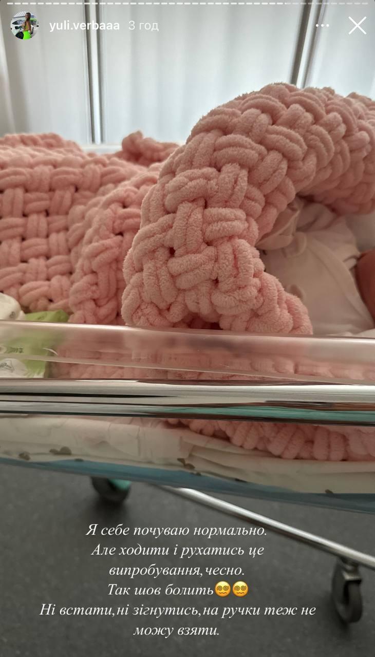 "Я почуваюся нормально. Але ходити і рухатись – це випробування, чесно. Шов болить. Ні встати, ні зігнутися, на ручки теж не можу взяти", – поділилася блогерка.