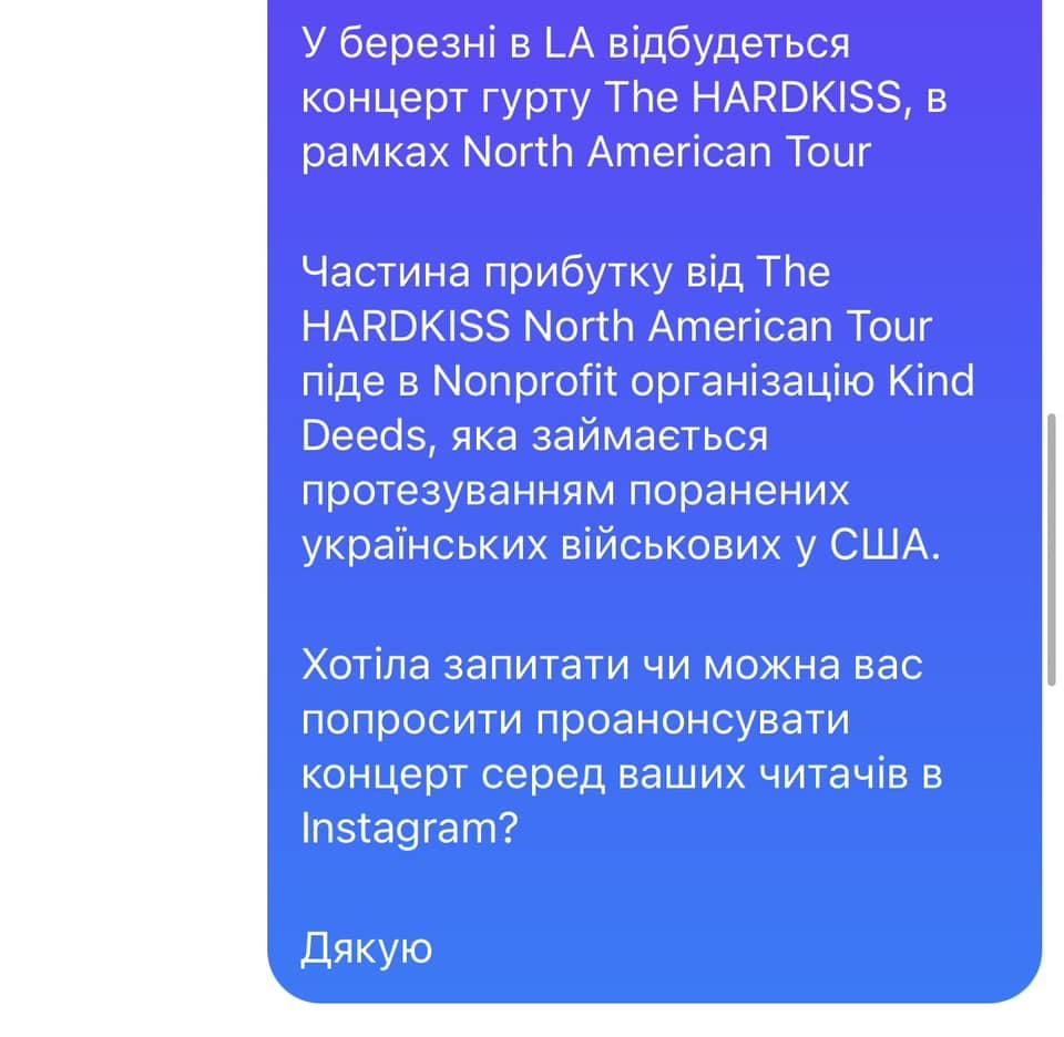 У мережі з'явилося листування з менеджером української блогерки Альони Венум, у якої попросили проанонсувати концерт групи The Hardkiss в Лос-Анджелесі в соціальних мережах блогерки, але відповідь "вбила".