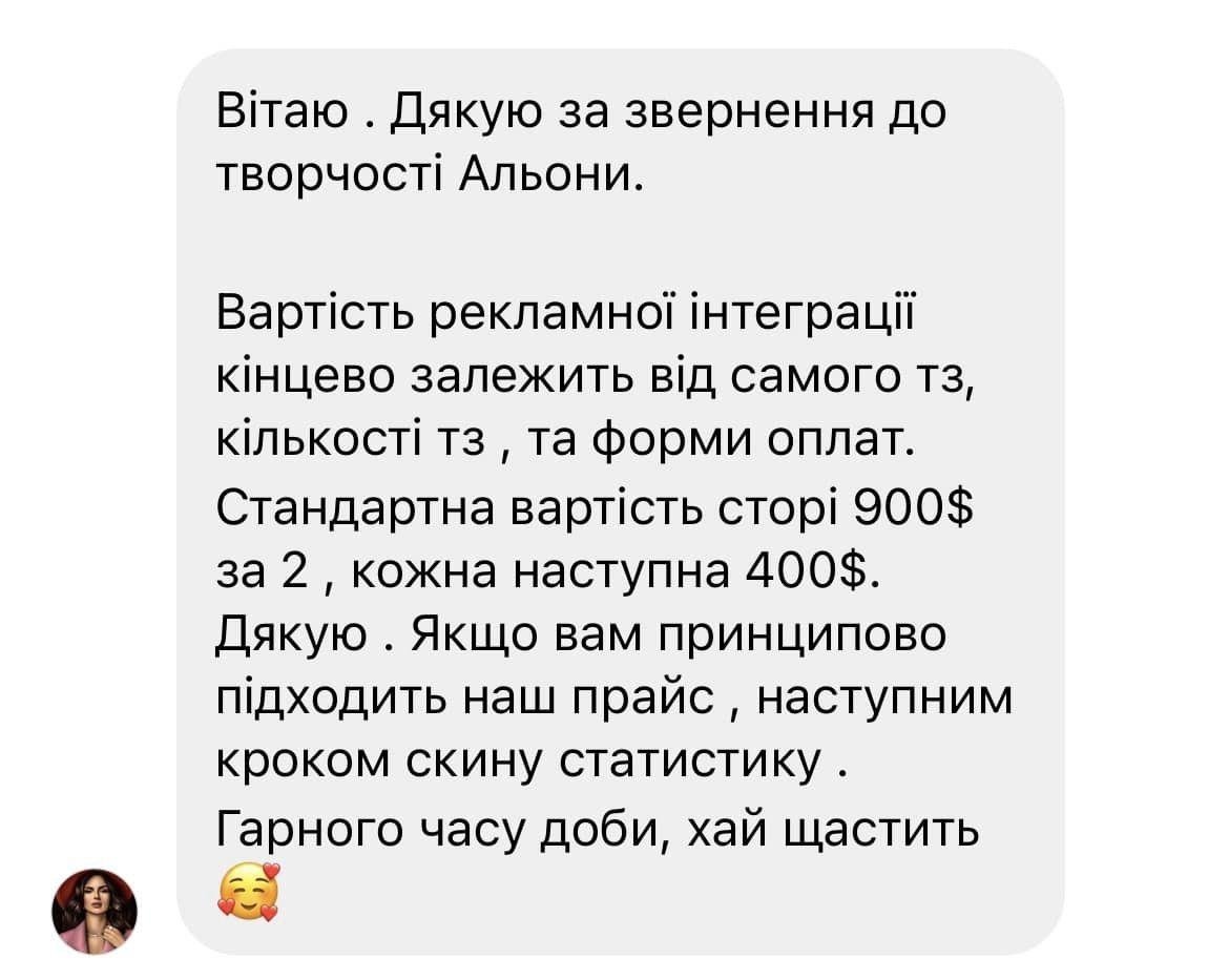 - "Маю аналогічний досвід спілкування з менеджером відомої блогерки і відомим українським телеведучим, які також вимагали подібний оверпрайс просто за сторіз по темі благодійності"