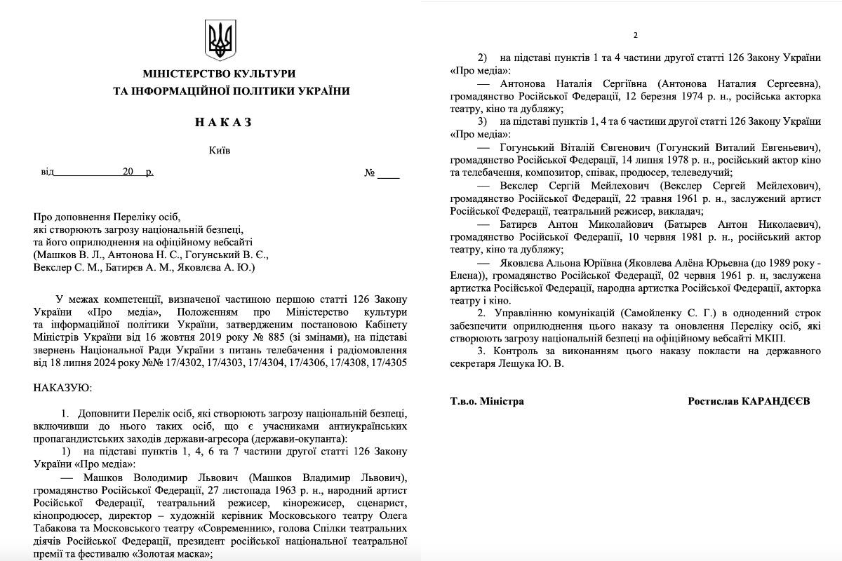 Міністерство культури та інформаційної політики України внесло до "чорного списку" ще шістьох російських акторів-пропагандистів. Ці люди підтримують загарбницьку політику Кремля та війну в Україні. Зокрема, йдеться про Володимира Машкова, Віталія Гугунського, якому СБУ раніше висунула підозру, Антона Батиряєва та інших.